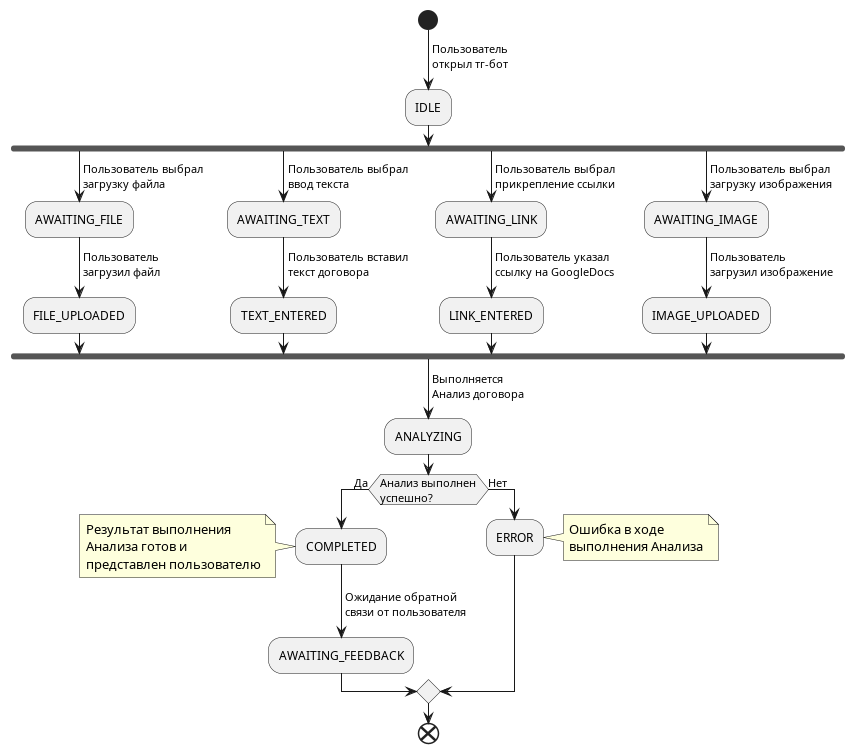 Анализ выполняется (парсинг → чанкинг → поиск → LLM) | TEXT_ENTERED, FILE_UPLOADED, LINK_ENTERED, IMAGE_UPLOADED |