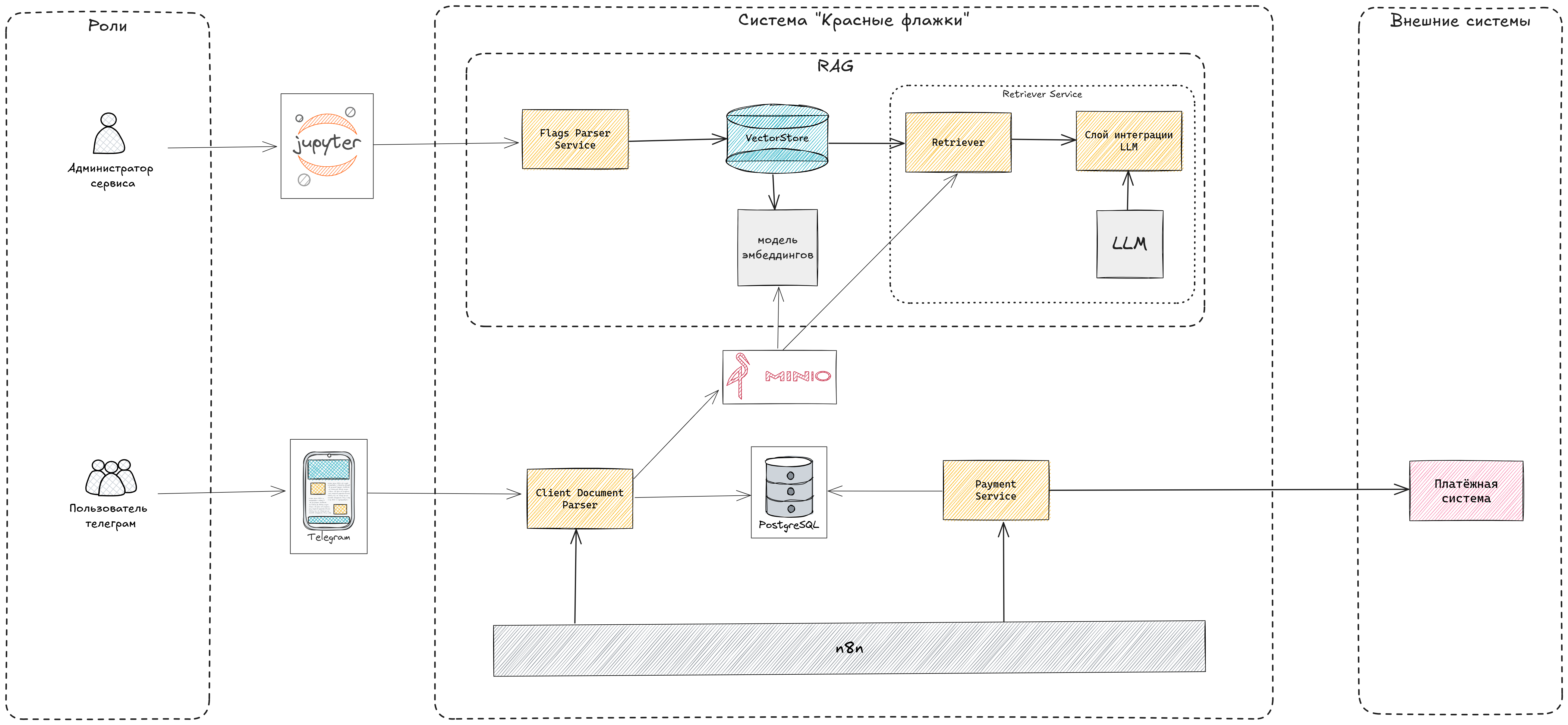 | "Красные флаги" | пункт в договоре или соглашении, который содержит потенциально рискованные или невыгодные условия для пользователя; особенности, на которые нужно обращать внимание, при загрузке документов в RAG |