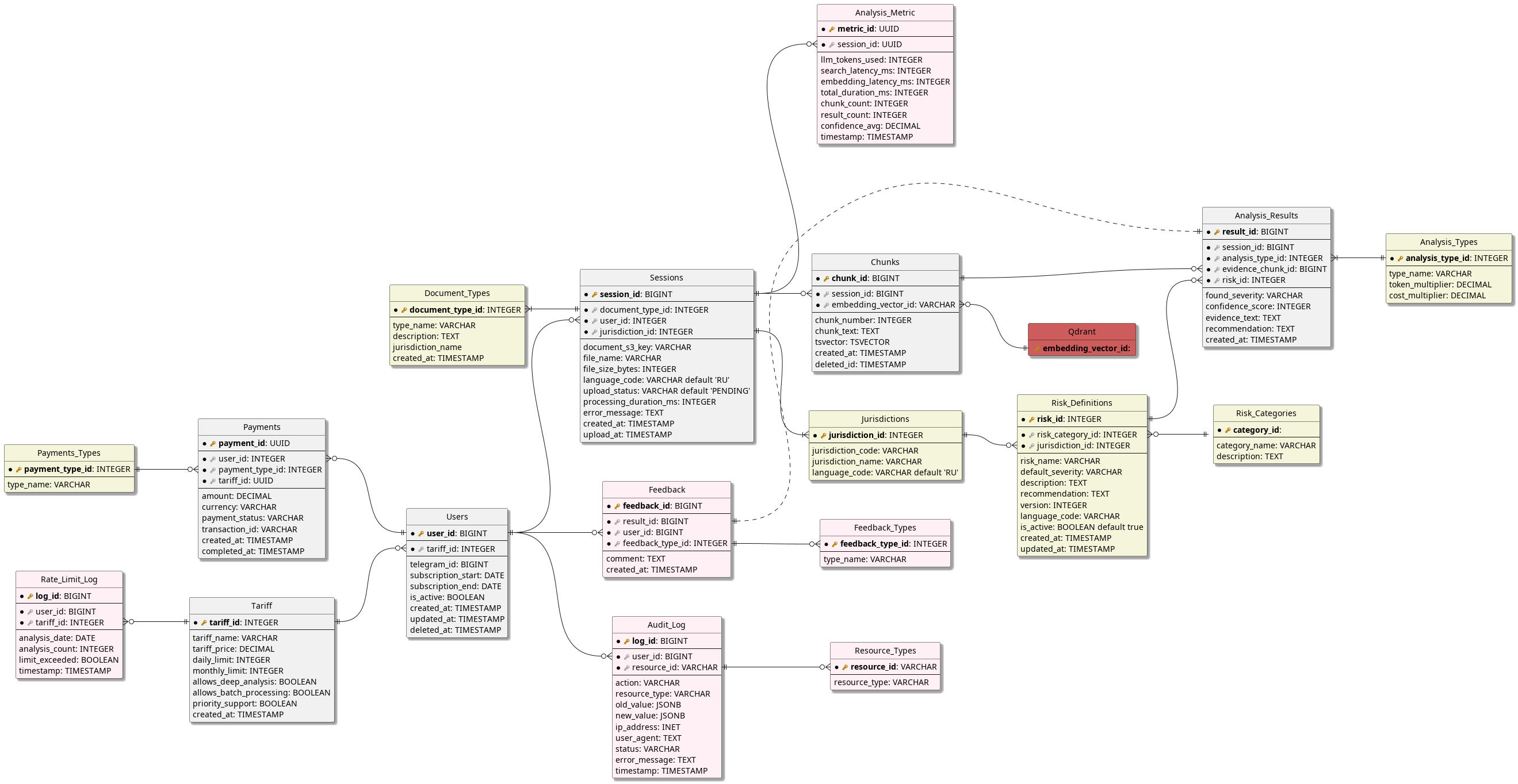 | ru_vector_documents | Таблица “красных флажков” в векторном хранилище | PK: document_vector_id FK: chunk_id FK: session_id FK: user_id |